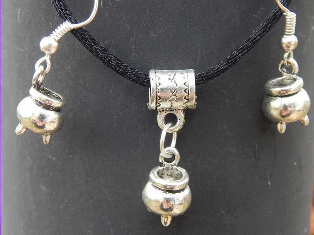 A lovely little cauldron with 3 little legs. Cauldron set, earrings with silver hooks & stoppers, pendant with black satin chord and clip fastening. Can all be purchased separately.