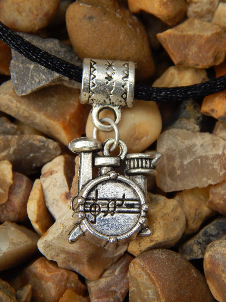 Get the drums rolling! Pendant drum set with black satin chord and clip fastening